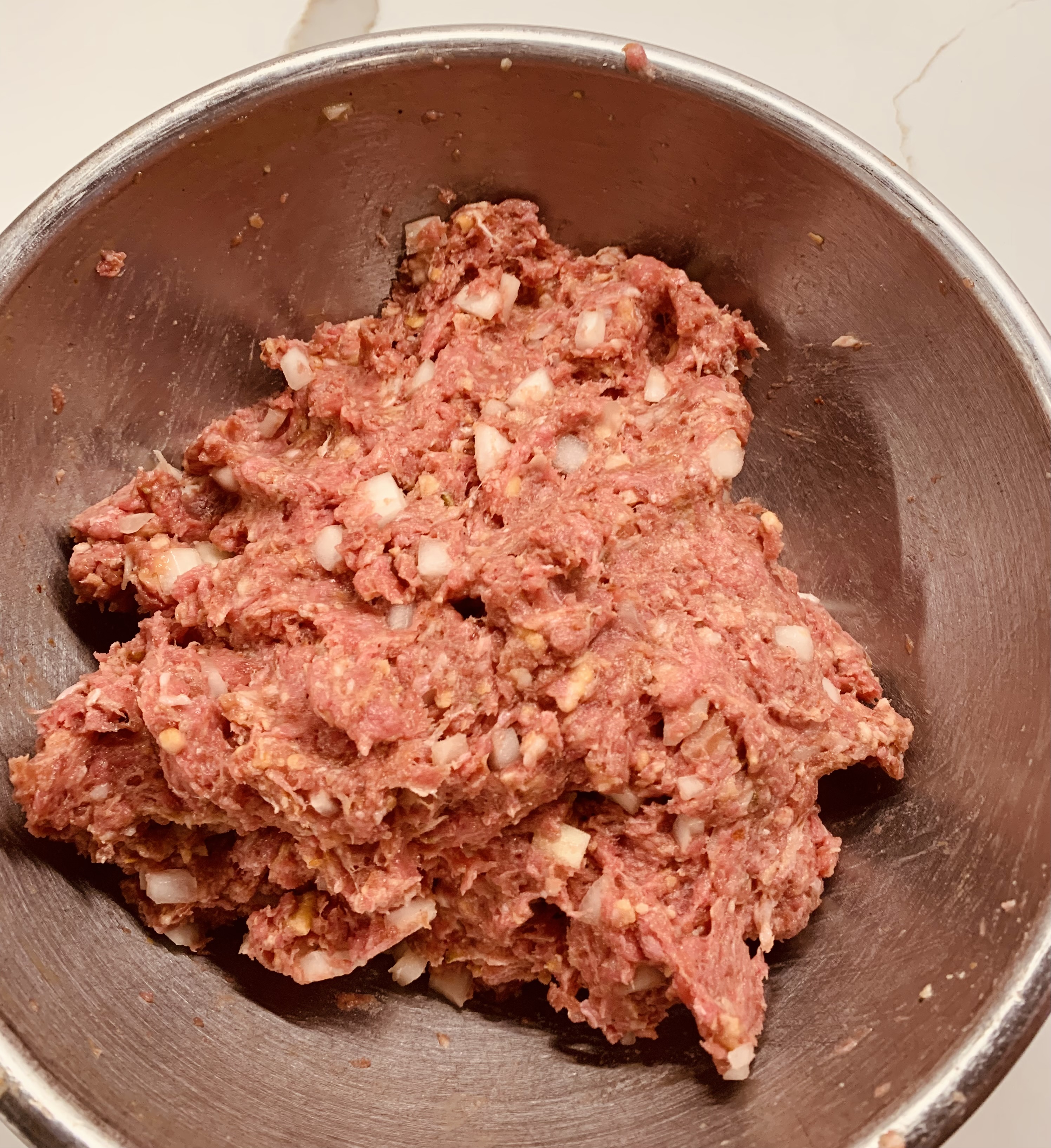 Now I am sure that the lovely man in this cookbook (“Mr. Food”) has a lovely meatloaf recipe, but I have never made his from the cookbook. This is my recipe that I have used forever. First – preheat your oven to 350 degrees. Then combine 2 lbs of ground beef, 1 lb of ground sausage (I always use sweet italian sausage if I can find it), 3 eggs, 1/3 cup of milk, 1 Tbsp of worcestershire sauce, 1 stack of Townhouse or Ritz crackers smashed into crumbs, 1 Tsbp of seasoning salt (I honestly just dump some in, so this is a guestimation), about 1 tsp of pepper, and one chopped onion.