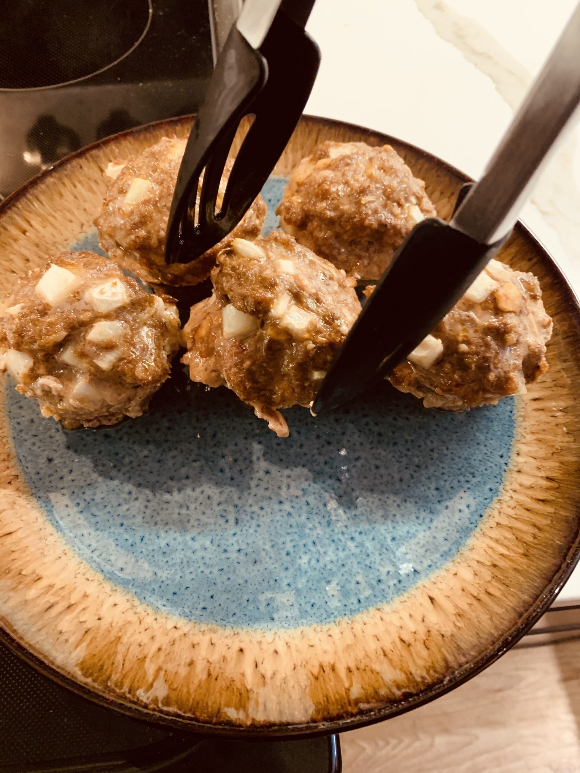 Throw these guys in the oven for about 15 minutes, and then put some ketchup on the top. I like to use a meat thermometer whenever I cook meat, because I am just a freak about that kind of stuff (expiration dates, cooking temperatures, germs, all of it… go ahead – make fun of me!) Bake with the ketchup on top for about 5-8 more minutes or until your thermometer reads 160 degrees. Then, take them out of the oven and transfer them to a plate.